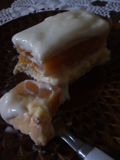 U dugačak kalup za štrudlu poređajte red keksa predhodno umočenog u mleko - pa vanil krem - pa ponovo red keksa - pa fil od kajsija - pa red keksa.